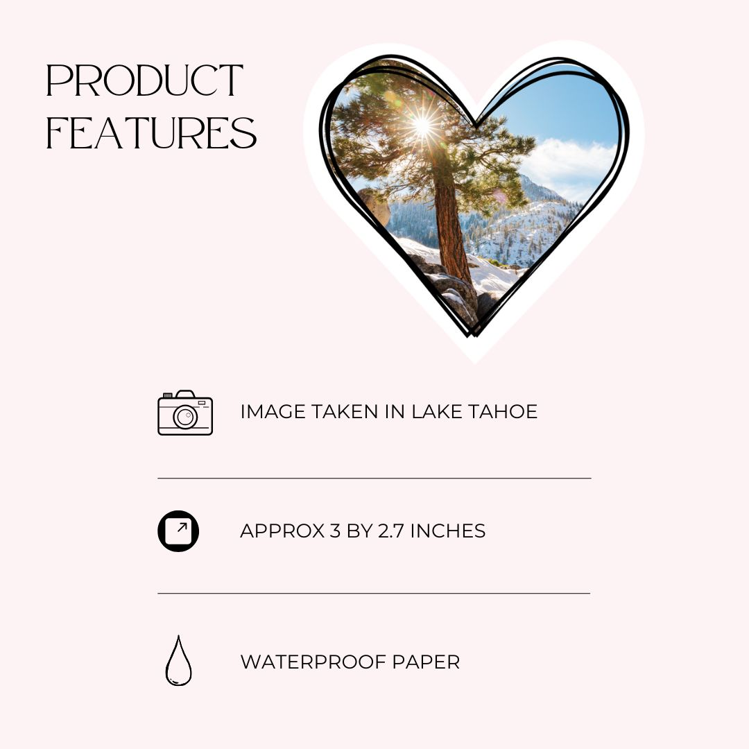 Take a piece of Lake Tahoe’s stunning scenery with you everywhere you go with this waterproof photo sticker in the shape of a heart.