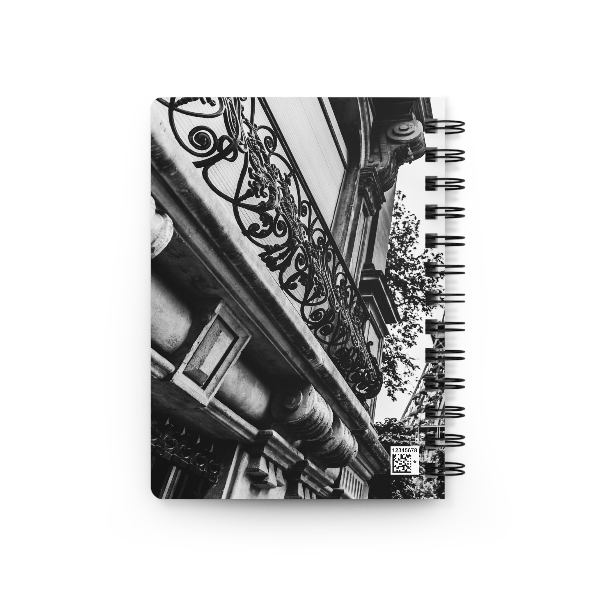 A spiral-bound journal that opens like a small Parisian daydream. The black-and-white photo of the Eiffel Tower feels like a quiet street corner at dusk — soft light, distant laughter, a breeze carrying coffee and paper.