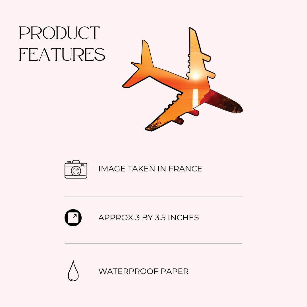 Elevate your travels with a piece of France! This waterproof airplane-shaped travel sticker features a breathtaking sunrise photo from the French countryside, capturing the magic of adventure.