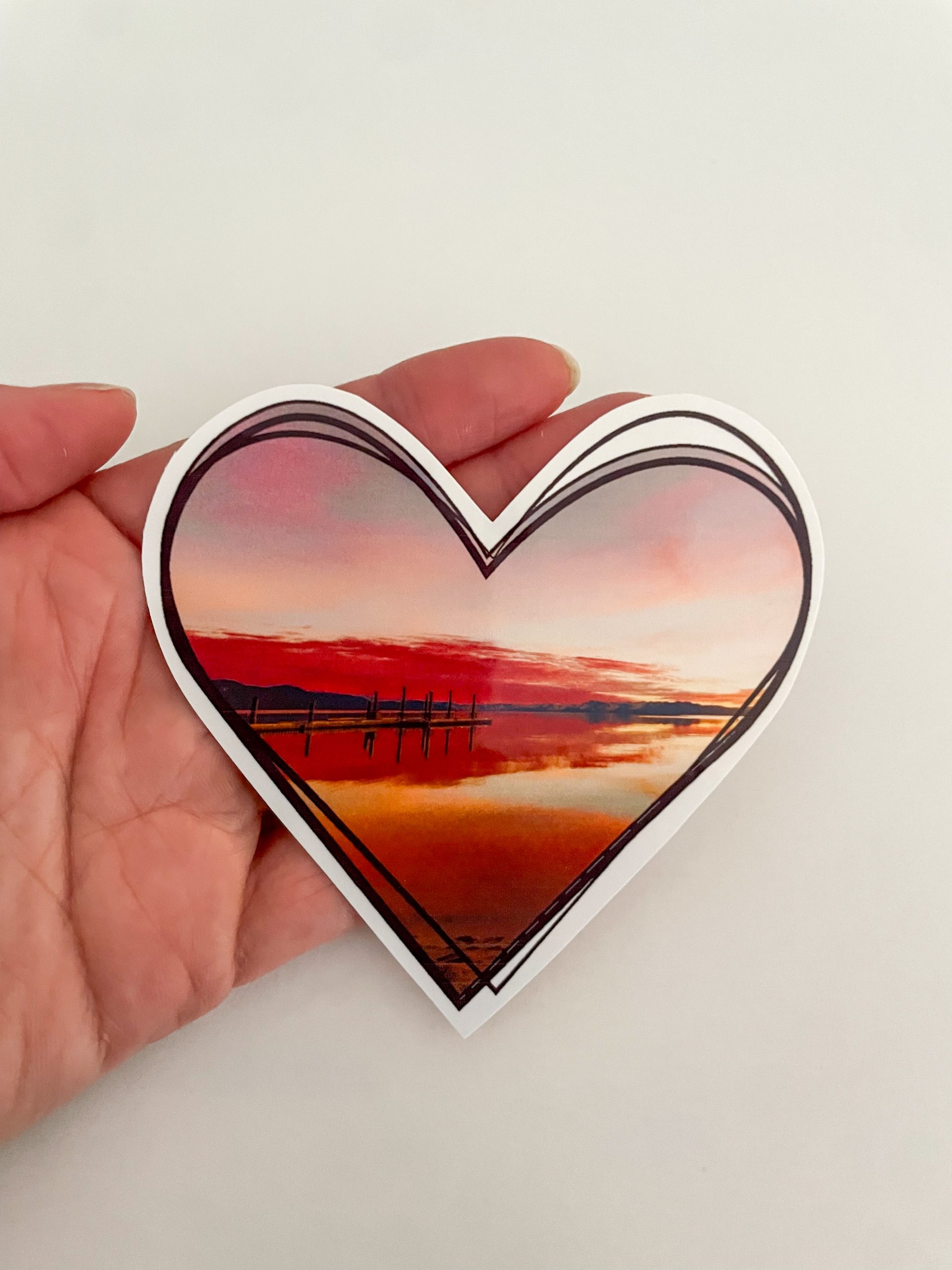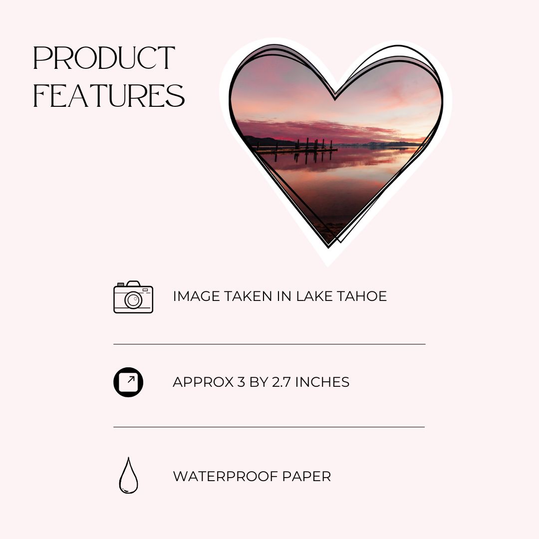 Bring the beauty of Lake Tahoe’s stunning sunsets right to your fingertips with this heart-shaped sticker featuring breathtaking beach photography.