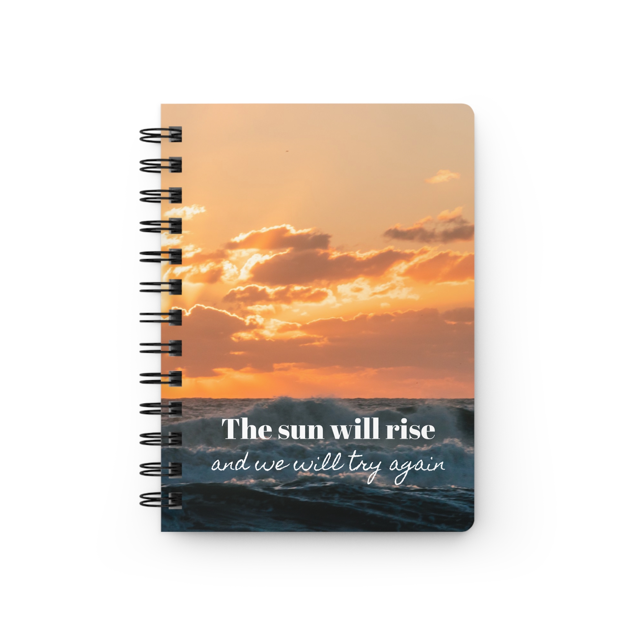 Morning light spills across a quiet shore. You open this spiral bound journal and the sunrise photo on the cover—soft golds and pale blues—reminds you that each day brings a fresh attempt. The cover’s glossy finish makes the image sing, while the sentiment “the sun will rise and we will try again” sits like a gentle promise at the top of every page.